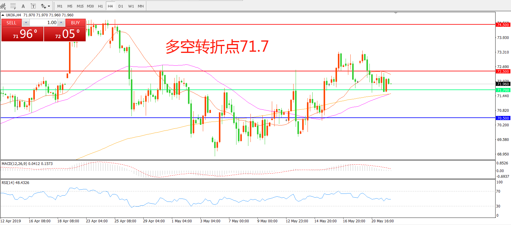 4小时图看,油价延续震荡态势,整体形态有形成双头走势迹象,55均线逐渐上行形成支撑, MACD红柱减少,RSI有拐头迹象,日内重点关注71.5附近得失。