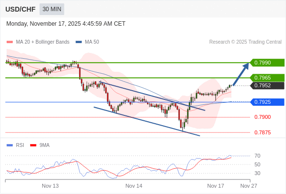 在 0.7925 之上,看涨,目标价位为 0.7965 ,然后为 0.7990 。