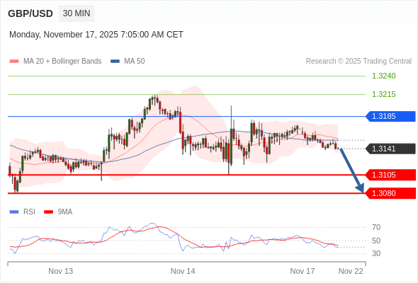 在 1.3185 之下,看跌,目标价位为 1.3105 ,然后为 1.3080 。