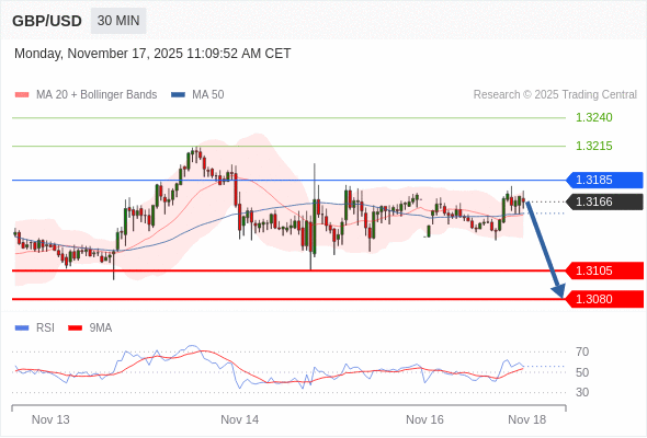 在 1.3185 之下,看跌,目标价位为 1.3105 ,然后为 1.3080 。