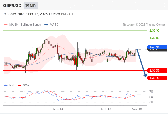 在 1.3185 之下,看跌,目标价位为 1.3105 ,然后为 1.3080 。