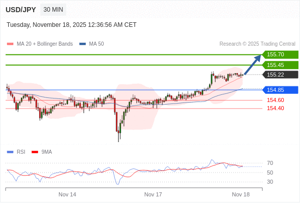 在 154.85 之上,看涨,目标价位为 155.45 ,然后为 155.70 。