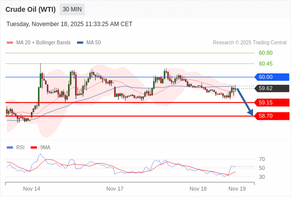 交易策略: 在 60.00 之下,看跌,目标价位为 59.15 ,然后为 58.70 。