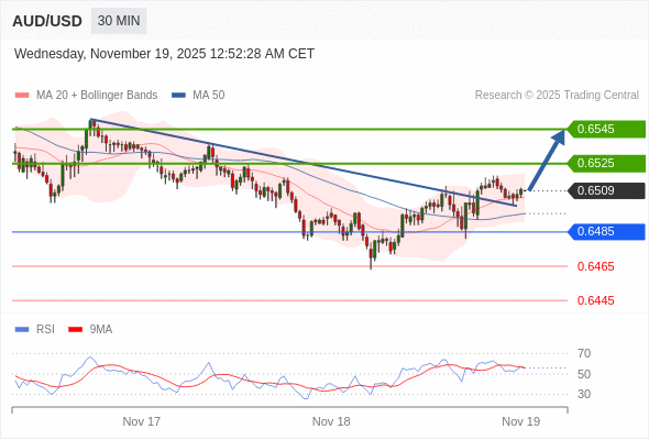 在 0.6485 之上,看涨,目标价位为 0.6525 ,然后为 0.6545 。