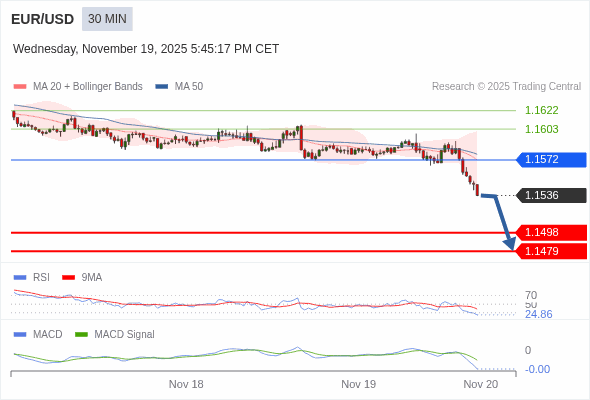 技术点评: RSI技术指标小于30。在这种情况下,说明有很强的下跌趋势,或者意味着处在超卖的状态下,可能会有向上的反弹。我们将观察RSI技术指标是否出现背离现象。 MACD技术指标处在其信号线之下看空。 配置为负。 此外,价位低于其20天及50天移动平均线 ( 分别位于1.1572 和1.1577 )。 最后,价位跌破其布林线通道下轨 (位于1.1542。
