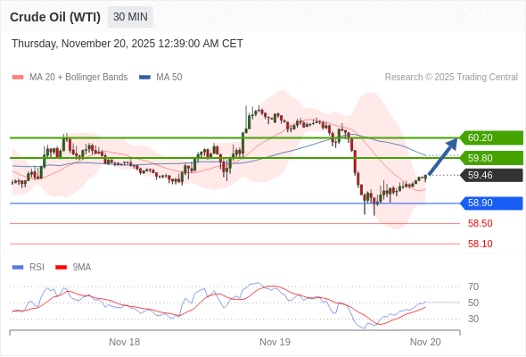 在 58.90 之上,看涨,目标价位为 59.80 ,然后为 60.20 。