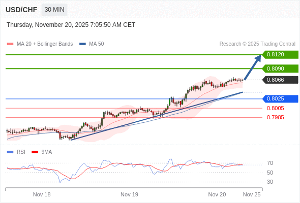 在 0.8025 之上,看涨,目标价位为 0.8090 ,然后为 0.8120 。
