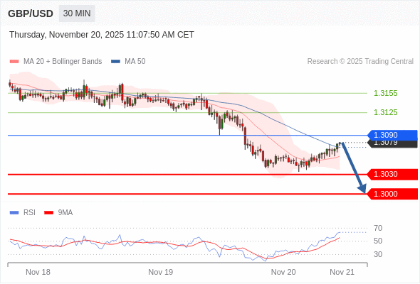 在 1.3090 之下,看跌,目标价位为 1.3030 ,然后为 1.3000 。