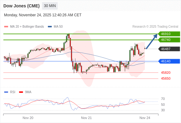 在 46140 之上,看涨,目标价位为 46740 ,然后为 46910 。