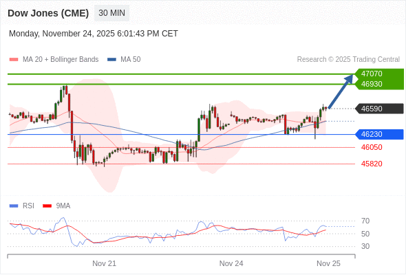 在 46230 之上,看涨,目标价位为 46930 ,然后为 47070 。