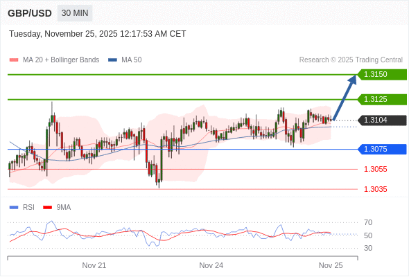 在 1.3075 之上,看涨,目标价位为 1.3125 ,然后为 1.3150 。