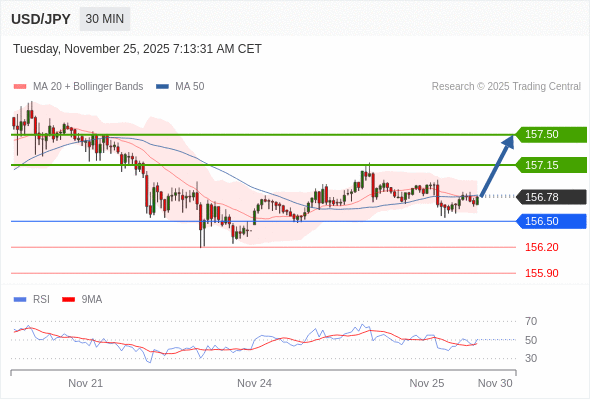 在 156.50 之上,看涨,目标价位为 157.15 ,然后为 157.50 。