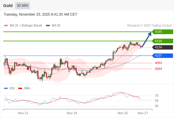 在 4107 之上,看涨,目标价位为 4155 ,然后为 4185 。