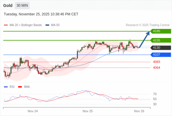 在 4107 之上,看涨,目标价位为 4155 ,然后为 4185 。