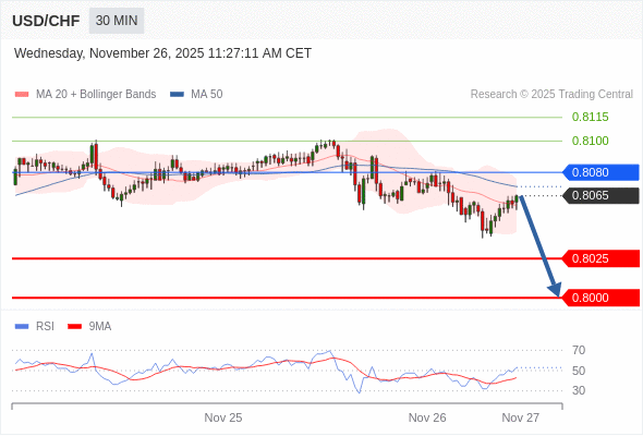 在 0.8080 之下,看跌,目标价位为 0.8025 ,然后为 0.8000 。