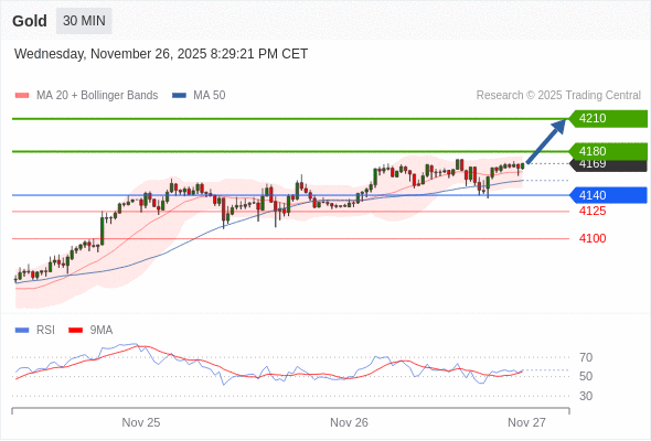 在 4140 之上,看涨,目标价位为 4180 ,然后为 4210 。