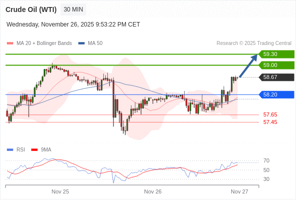 在 58.20 之上,看涨,目标价位为 59.00 ,然后为 59.30 。