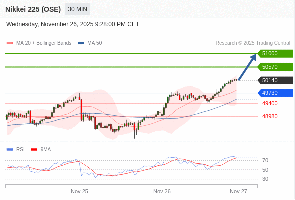 在 49730 之上,看涨,目标价位为 50570 ,然后为 51000 。