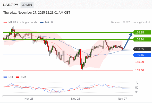 在 156.15 之上,看涨,目标价位为 156.70 ,然后为 156.95 。