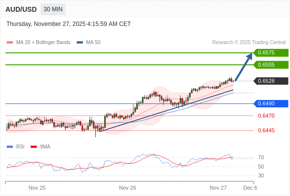 在 0.6490 之上,看涨,目标价位为 0.6555 ,然后为 0.6575 。