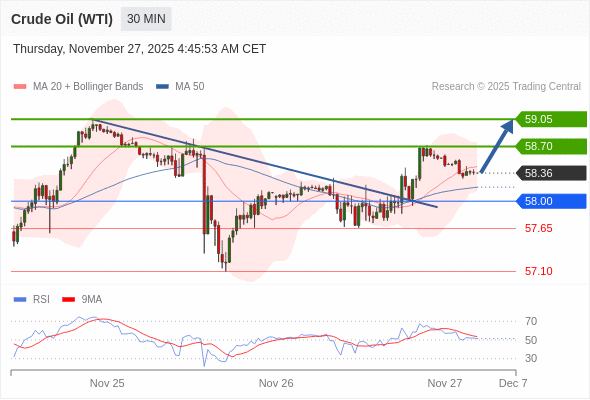 在 58.00 之上,看涨,目标价位为 58.70 ,然后为 59.05 。