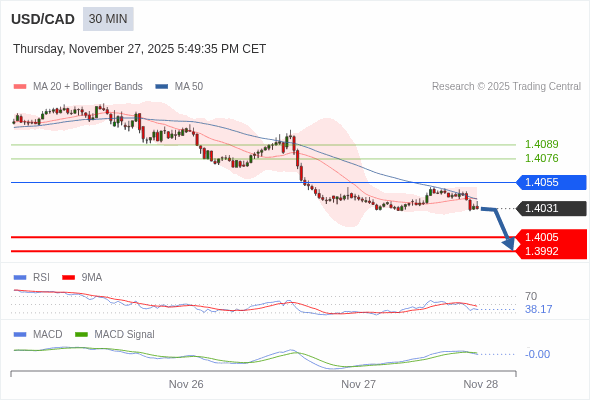 美元/加元 当日内 : 看跌,在 1.4055 之下。