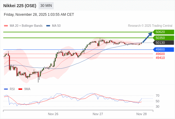 日经225股指期货 (OSE) 当日内: 在49800之上,看涨。