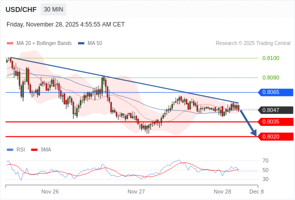 在 0.8065 之下,看跌,目标价位为 0.8035 ,然后为 0.8020 。