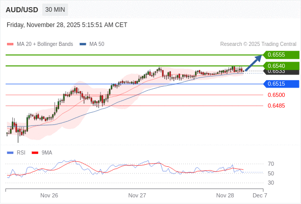 在 0.6515 之上,看涨,目标价位为 0.6540 ,然后为 0.6555 。