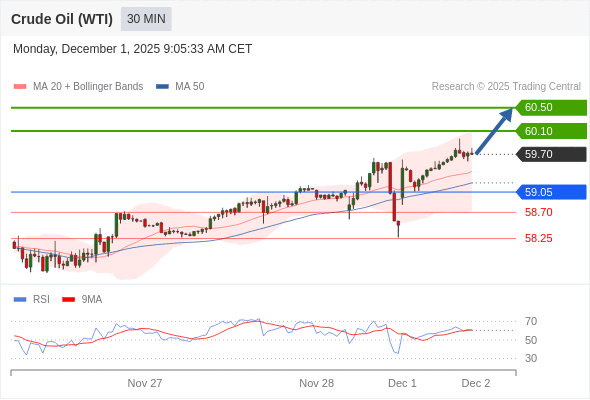 在 59.05 之上,看涨,目标价位为 60.10 ,然后为 60.50 。