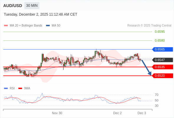 在 0.6565 之下,看跌,目标价位为 0.6535 ,然后为 0.6520 。