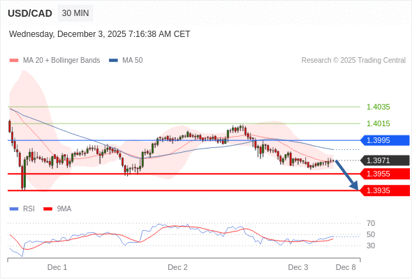 在 1.3995 之下,看跌,目标价位为 1.3955 ,然后为 1.3935 。