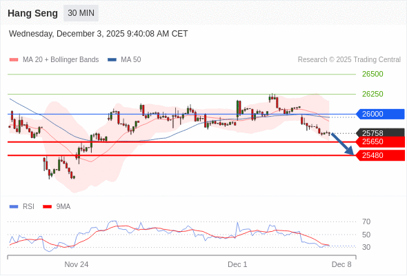 恒生指数 当日内: 朝25480运行。