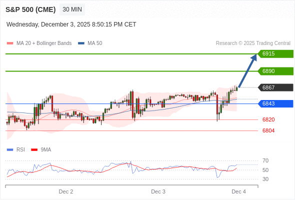 在 6843 之上,看涨,目标价位为 6890 ,然后为 6915 。