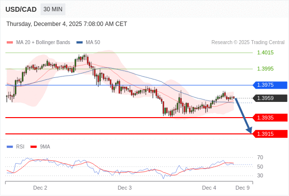 在 1.3975 之下,看跌,目标价位为 1.3935 ,然后为 1.3915 。