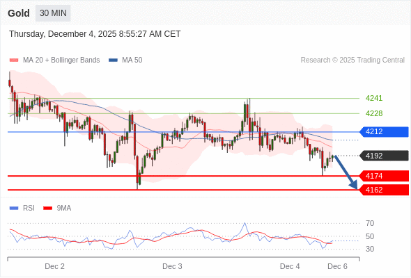 在 4212 之下,看跌,目标价位为 4174 ,然后为 4162 。