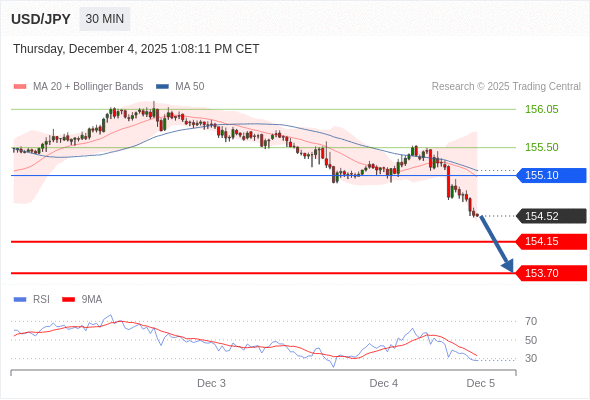 在 155.10 之下,看跌,目标价位为 154.15 ,然后为 153.70 。
