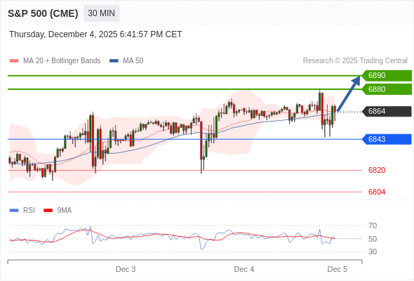 在 6843 之上,看涨,目标价位为 6878 ,然后为 6890 。