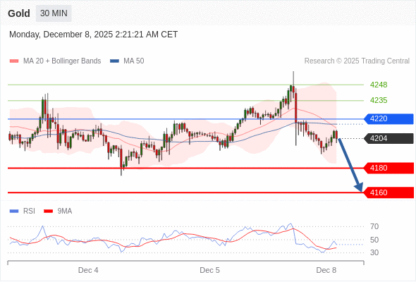 在 4220 之下,看跌,目标价位为 4180 ,然后为 4160 。