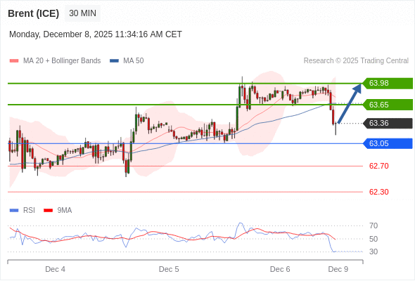 在 63.05 之上,看涨,目标价位为 63.65 ,然后为 63.98 。