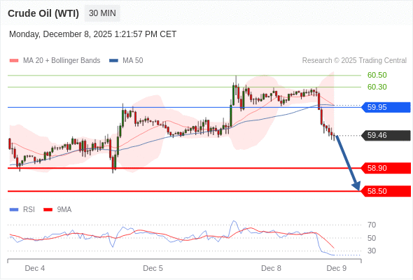 在 59.95 之下,看跌,目标价位为 58.90 ,然后为 58.50 。