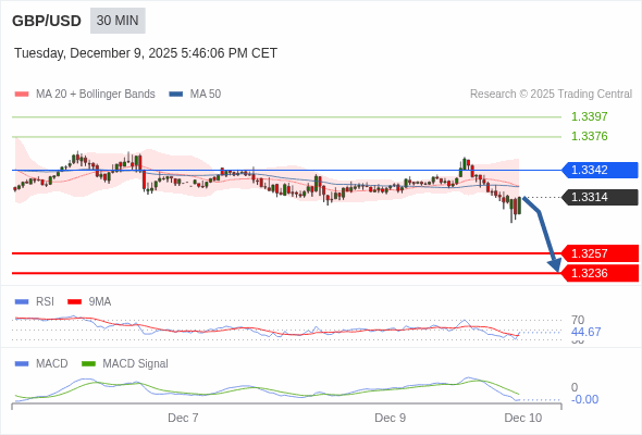 技术点评: RSI技术指标小于中性区域50。 MACD技术指标处在其信号线之下看空。 配置为负。 此外,价位低于其20天及50天移动平均线 ( 分别位于1.3326 和1.3325 )。