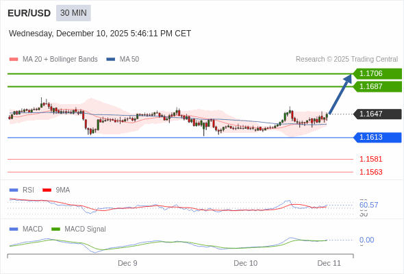 欧元/美元 当日内 : 看涨,当 1.1613 为支撑位。