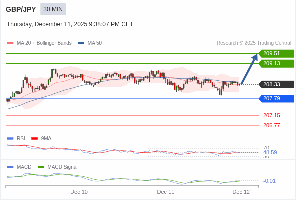 英镑/日元 当日内 : 有上涨的可能,目标价位定在 209.51 。
