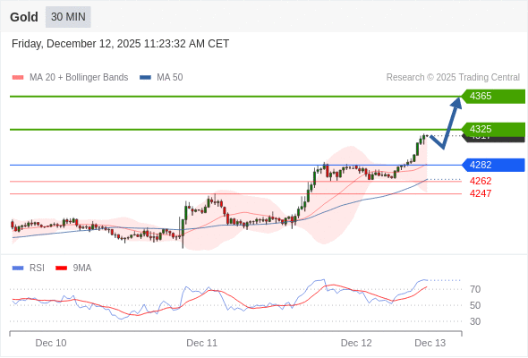 在 4282 之上,看涨,目标价位为 4325 ,然后为 4365 。