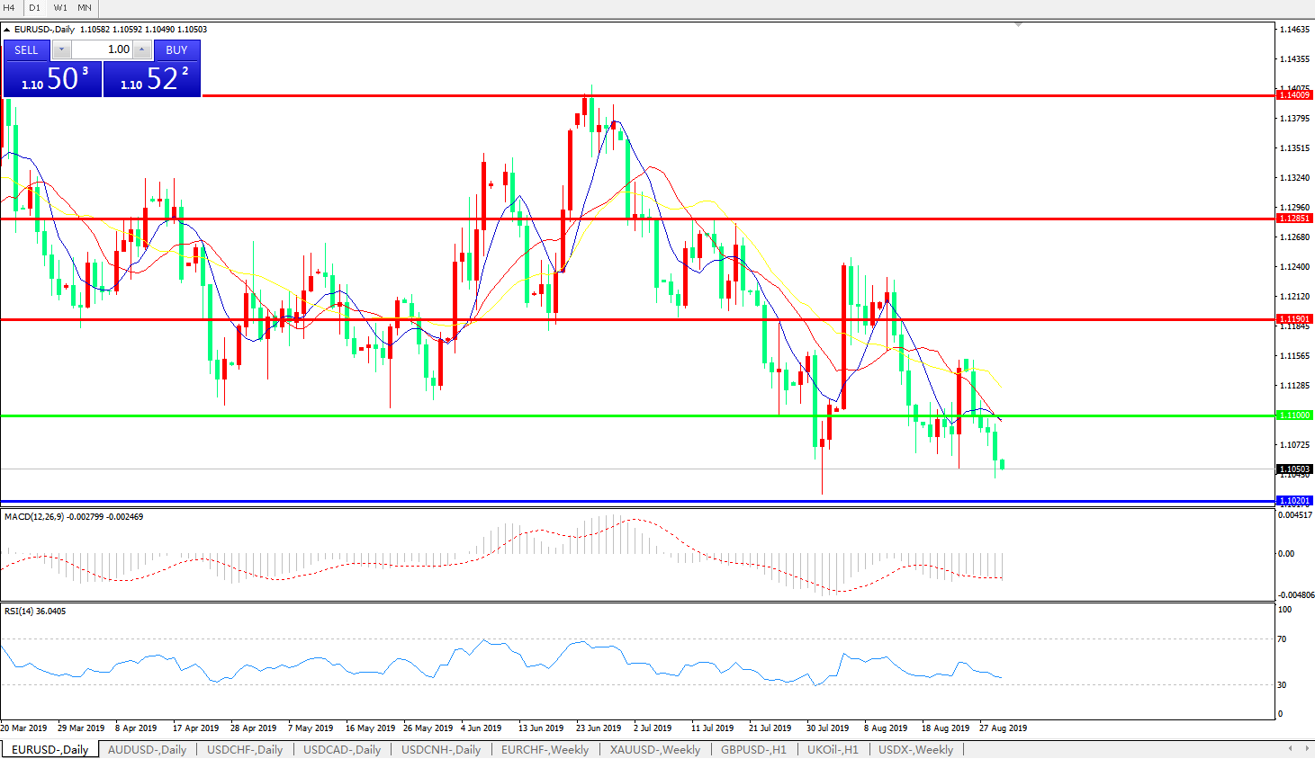 技术面简析:日图均线整体仍呈空头趋势,汇价呈连续下跌态势,MACD运行于0轴下方且动能柱量能维持,RSI逐步走低,预计短期存进一步下行空间,中期需关注1.1020附近支撑以及欧央行宽松及美联储降息的预期及影响。
