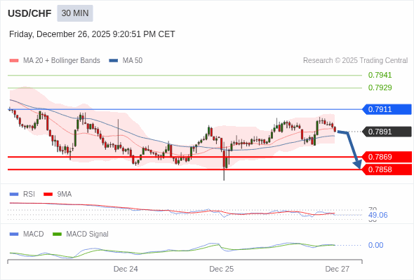 美元/瑞郎 当日内 : 逐渐下跌,当 0.7911 阻碍上行,则 0.7858 为目标位。