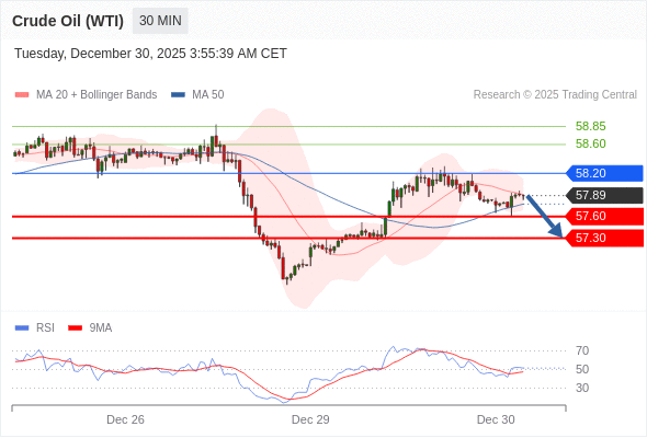 在 58.20 之下,看跌,目标价位为 57.60 ,然后为 57.30 。