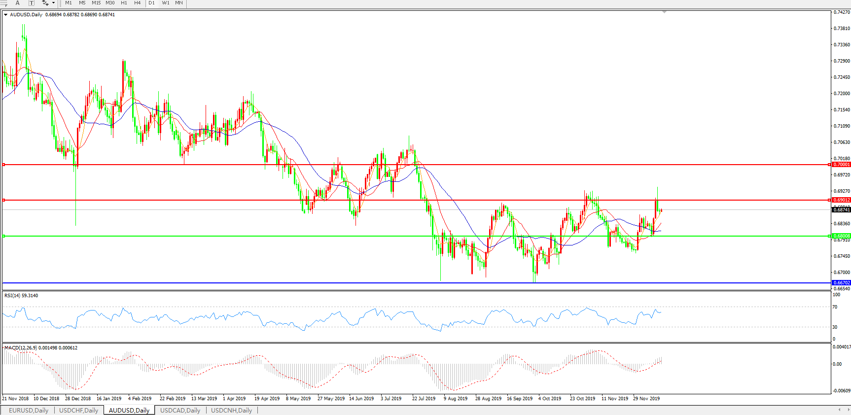 澳元兑美元在周五开盘跳涨至0.6939这一四个半月新高,并升破了200日均线,虽然此后汇价有所回落,但是本周的涨幅仍然可观。因国际贸易情绪出现转机,使得对贸易尤为敏感的澳元“春江水暖鸭先知”; 市场因而开始揣测澳元汇价是否已出现中期反转,因为自2018年4月以来,澳元兑美元从未在日线收盘站上200日均线,而如果本周五收于0.6911之上,就能实现突破,为之后的进一步反转走势铺平道路。鉴于本周美联储决议的鸽派程度超出预期,因此,澳洲联储此前的坚定稳健力长得到了市场重新咀嚼,这样的基调下,澳元在上破关键阻力后,将有望打开全面上行空间。