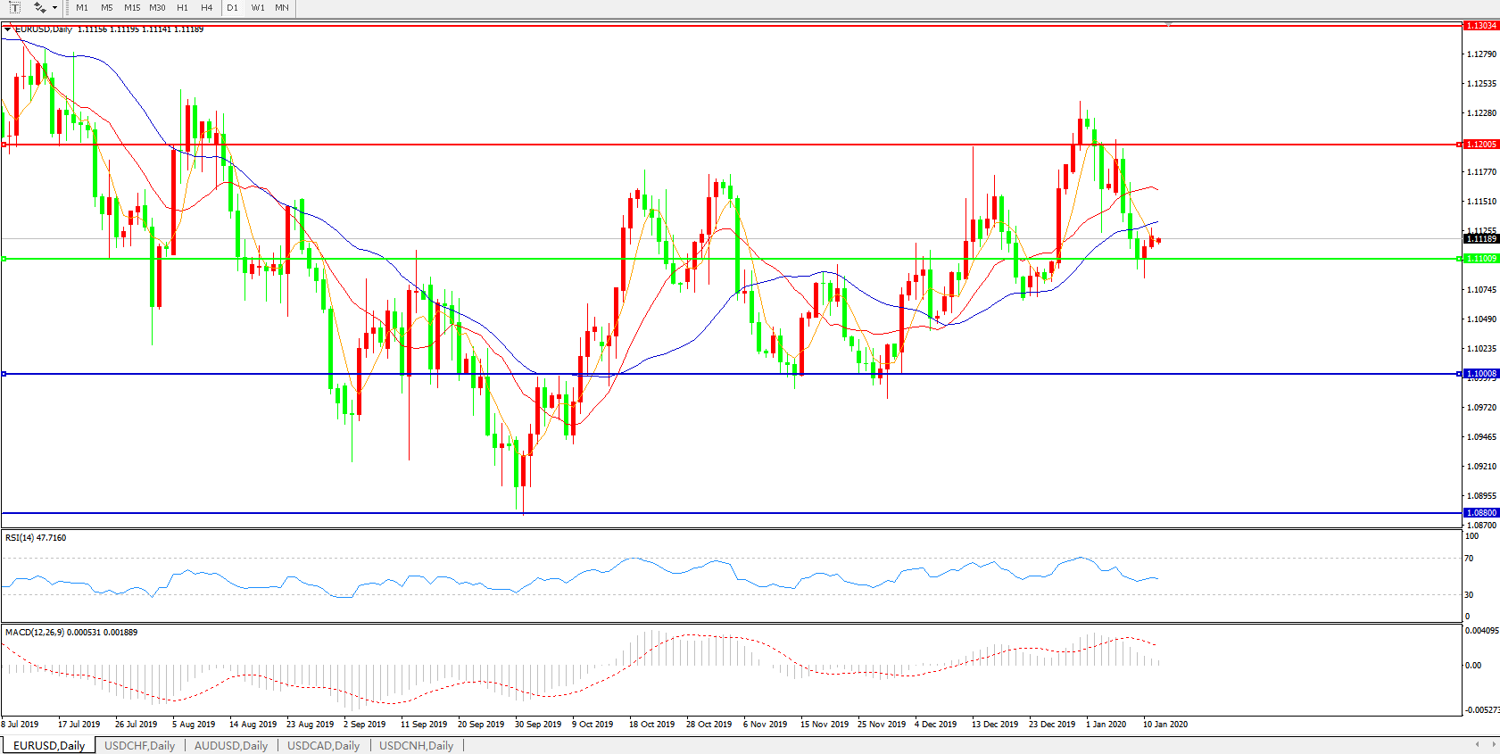 技术面简析:日图短期均线开始形成死叉,汇价近日小幅反弹暂时企稳1.11关口MACD开始下行且量能快速萎缩 RSI缓步走低,预计汇价大概率将弱势整理,重点关注下方1.11关口的支撑